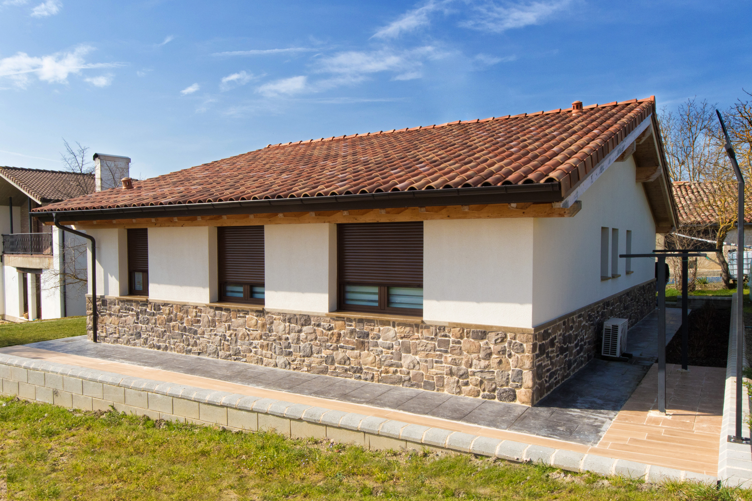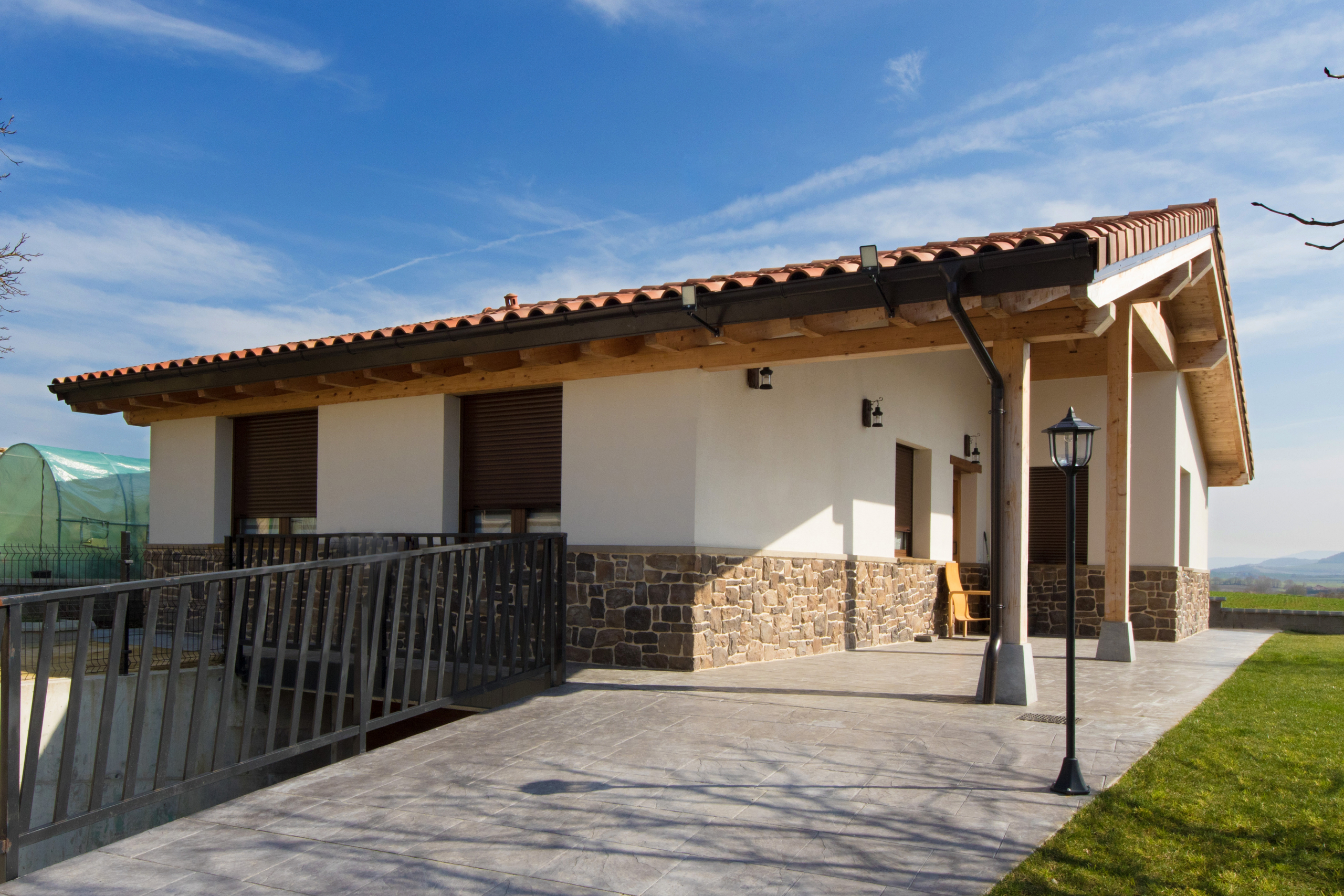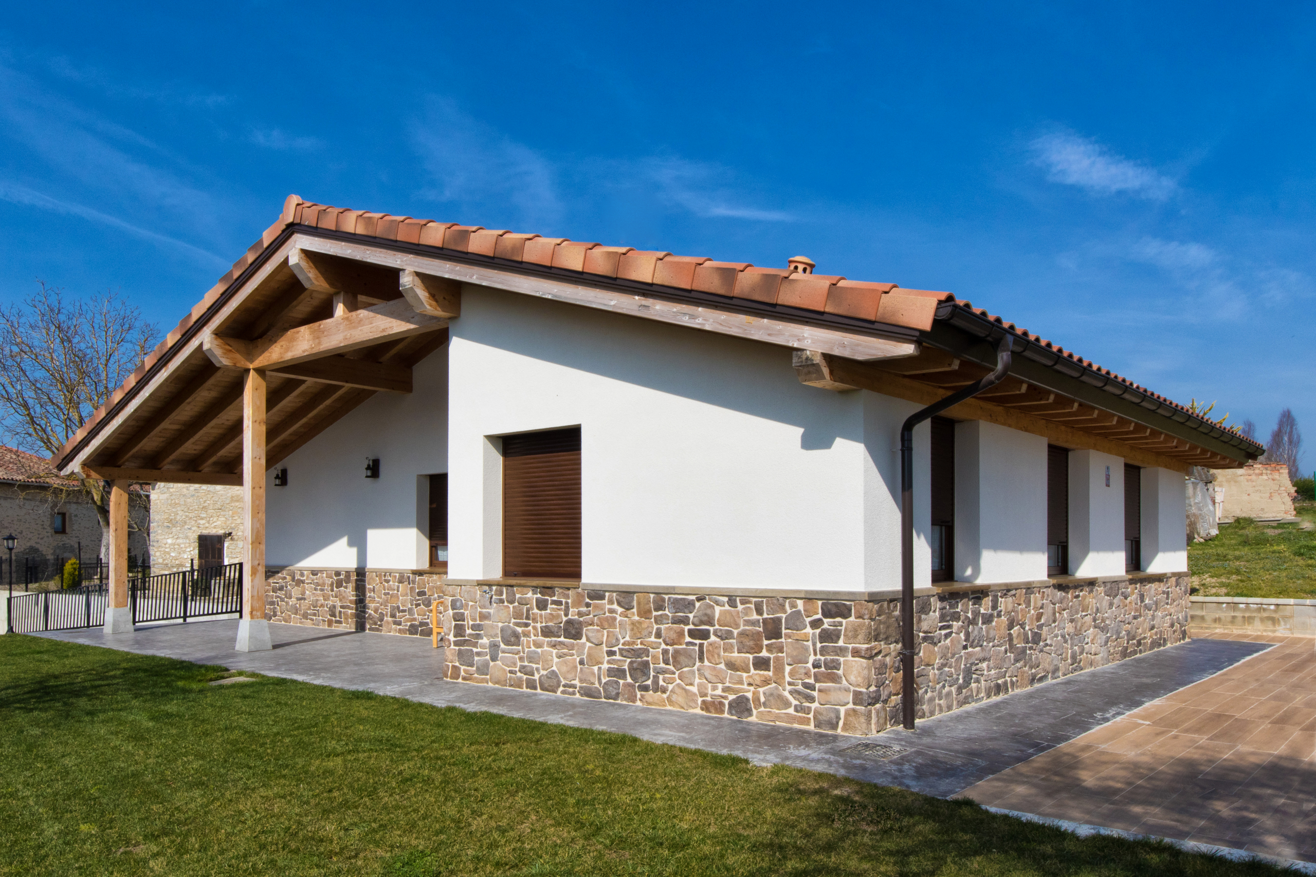 En cuanto al aspecto formal, la vivienda se ha mostrado hacia el espacio libre de la parcela mediante una fachada tradicional, con gran presencia de la estructura de madera del porche. El recubrimiento de cubierta es teja cerámica mixta, en color rojo, y los acabados exteriores son de piedra, en zócalo, esquineros y cercos de huecos de fachada, quedando el resto recubierto de mortero monocapa en tono beige. Las carpinterías son de aluminio imitación madera.